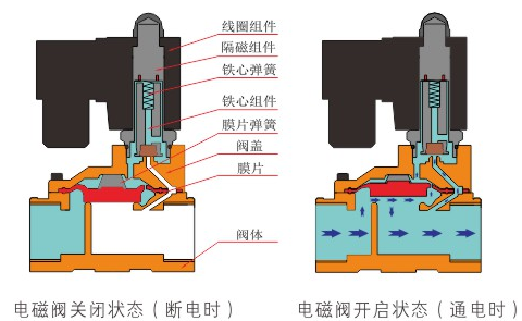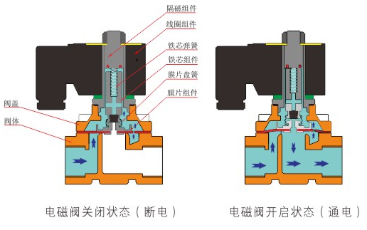 原理:上海赵明环保科技有限公司直动式电磁阀分常闭型和常开型两种。常闭型电磁阀断电时为关闭状态,线圈通电时产生电磁力,动铁芯跟静铁芯吸合,电磁阀阀口打开,介质(流体)通过;当电磁阀线圈断电时电磁阀消失,在弹簧的作用力下,电磁阀动铁芯复位,阀口关闭,介质(流体)不同,电磁阀呈关闭状态。常开型与之相反。
